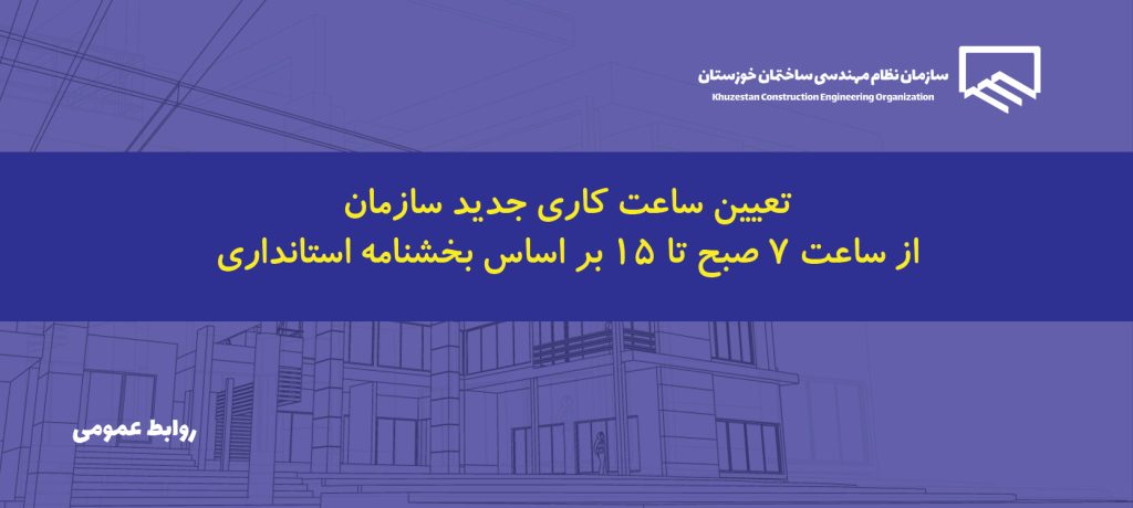 01 آبان اخبار روز, اخبار سازمان, اخبار سازمان, اخبار و اطلاعیه ها, مهمترین اخبار ارسال توسط alikhani 0 دیدگاه ابلاغ ساعت کاری جدید ادارات خوزستان از سوی استانداری به گزارش روابط عمومی سازمان نظام مهندسی ساختمان خوزستان، کیامرث حاجیزاده معاون توسعه مدیریت و منابع استانداری خوزستان ب... ادامه مطلب