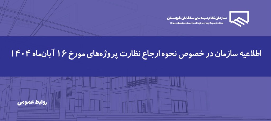 18 آبان اخبار روز, اخبار سازمان, اخبار سازمان, اخبار و اطلاعیه ها, مهمترین اخبار ارسال توسط alikhani 0 دیدگاه اطلاعیه سازمان در پی بروز اختلال در فرآیند ارجاع نظارت مورخ ۱۶ آبانماه 1404 با توجه به نقص پیشآمده و بر اساس نتایج توزیع نظارت مورخ ۱۶ آبان ماه سال جاری و انتخاب چهار پروژه توسط یکی از شرکتهای ح... ادامه مطلب