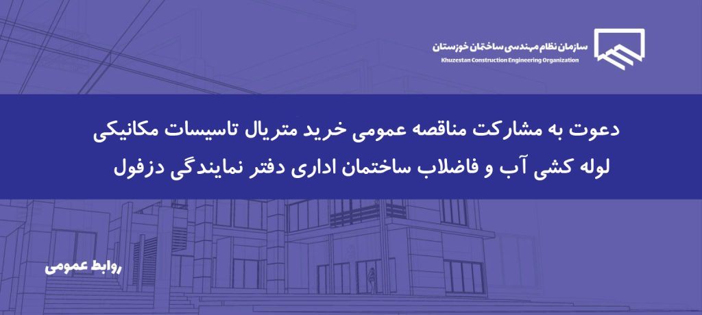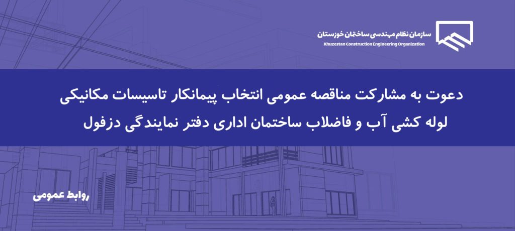 20 آبان اخبار روز, اخبار سازمان, اخبار سازمان, اخبار و اطلاعیه ها, اطلاعیه ها, مناقصات, مهمترین اخبار ارسال توسط روابط عمومی 0 دیدگاه فراخوان مناقصه عمومی انتخاب پیمانکار تاسیسات مکانیکی لوله کشی آب و فاضلاب ساختمان اداری دزفول به اطلاع می رساند سازمان نظام مهندسی ساختمان استان خوزستان در نظر دارد نسبت به برگزاری مناقصه با موضوع انتخاب پیمانکار ت... ادامه مطلب