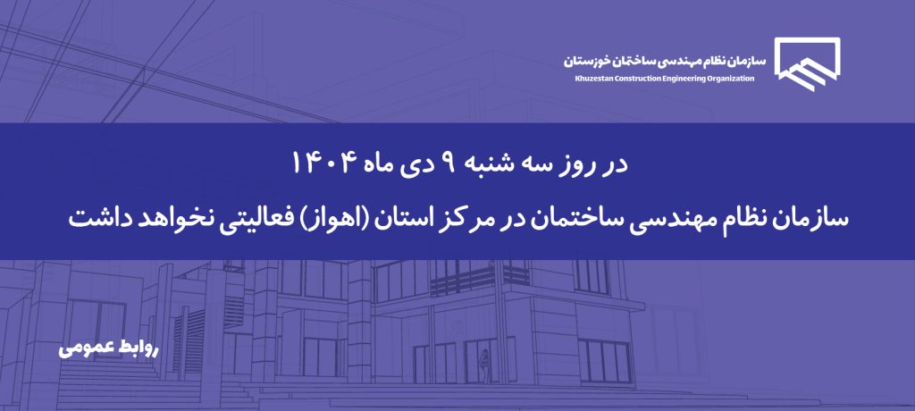 08 دی اخبار روز, اخبار سازمان, اخبار سازمان, اخبار و اطلاعیه ها, مهمترین اخبار ارسال توسط alikhani 0 دیدگاه تعطیلی سازمان در روز سه شنبه 9 دی ماه 1404 به اطلاع اعضای محترم سازمان و مراجعان گرامی میرساند؛ بر اساس تصمیم استانداری خوزستان و با توجه به برگزاری مراسم تشییع پ... ادامه مطلب