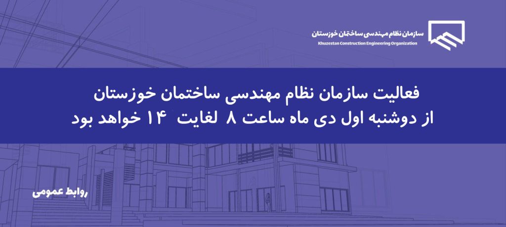 30 آذر اخبار روز, اخبار سازمان, اخبار سازمان, اخبار و اطلاعیه ها, اطلاعیه ها, مهمترین اخبار ارسال توسط روابط عمومی 0 دیدگاه تغییر ساعت فعالیت سازمان نظام مهندسی ساختمان خوزستان به گزارش روابطعمومی سازمان نظام مهندسی ساختمان استان خوزستان، پیرو بخشنامه ابلاغی معاونت توسعه مدیریت و منابع... ادامه مطلب