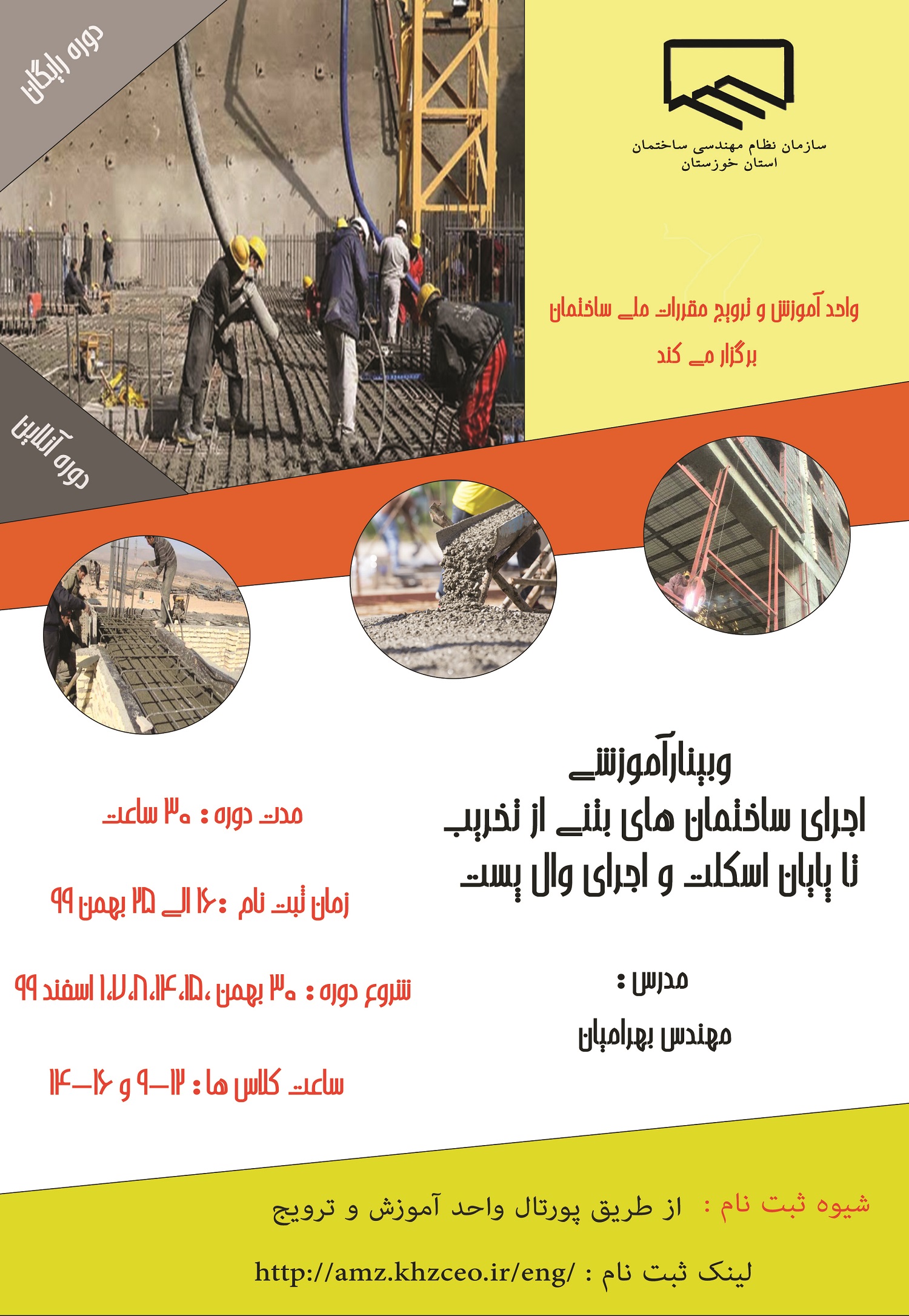 به گزارش روابط عمومی سازمان نظام مهندسی ساختمان خوزستان، واحد آموزش و ترویج سازمان در نظر دارد “وبینار آموزشی اجرای ساختمان های بتنی از تخریب تا پایان اسکلت و اجرای وال پست” را برگزار نماید.