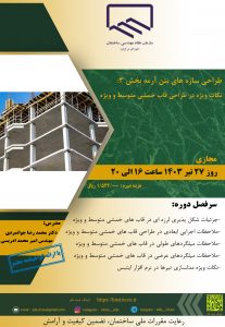 به گزارش روابط عمومی نظام مهندسی خوزستان به نقل از مدیریت آموزش نظام مهندسی کشور دوره آموزشی با عنوان“ دوره طراحی سازه های بتن آرمه بخش 3 : نکات ویژه در طراحی قاب خمشی متوسط و ویژه “ در روز چهارشنبه 27 تیرماه 1403 از ساعت 16 الی 20 برگزار می نماید.