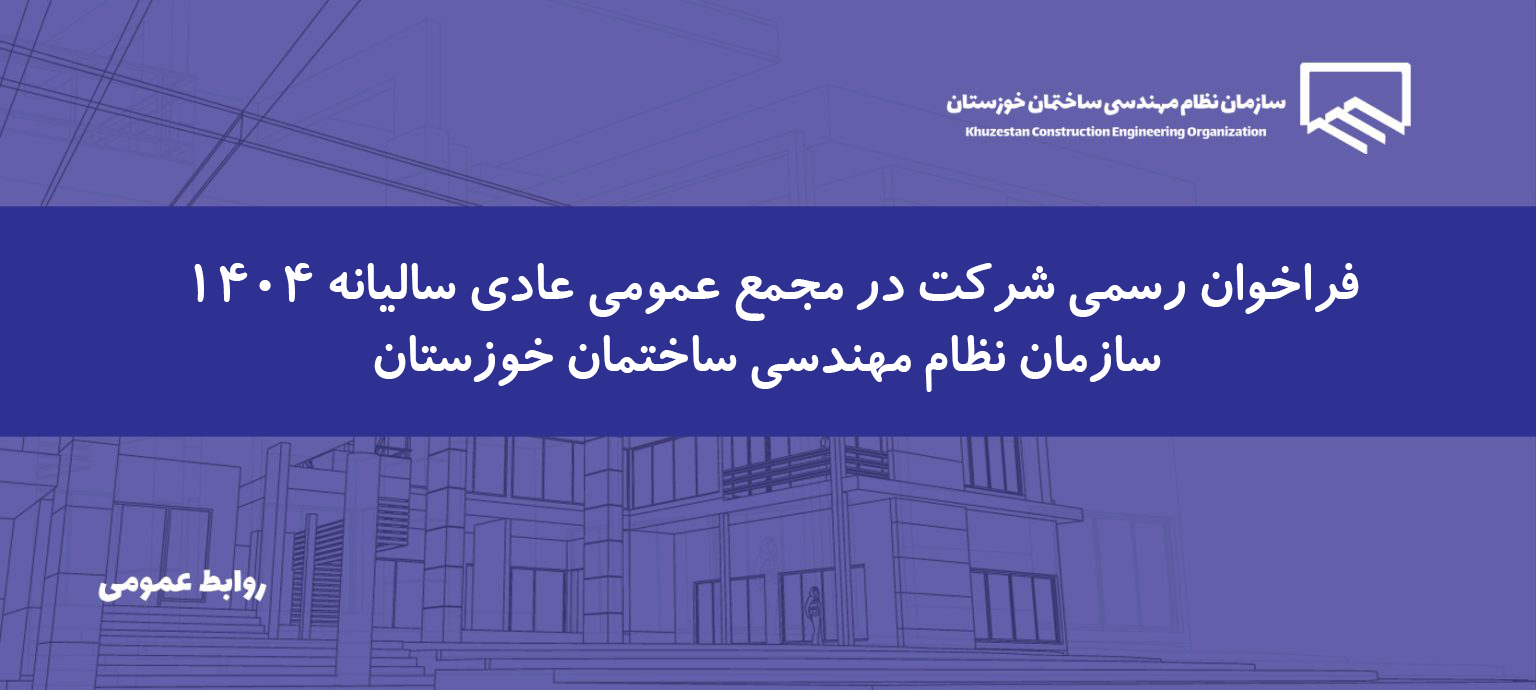 بدینوسیله از کلیه اعضای سازمان نظام مهندسی ساختمان استان خوزستان که دارای عضویت معتبر می باشند جهت شرکت در مجمع عمومی عادی سالیانه (نوبت اول) که در روز سه شنبه 23 دی ماه 1404 راس ساعت 15 در محل سازمان نظام مهندسی ساختمان خوزستان واقع در اهواز، کیانپارس، خیابان 12 غربی، فاز سوم، پلاک 76 طبقه همکف برگزار می گردد، دعوت به عمل می آید. در صورت عدم حصول حد نصاب لازم در مجمع عمومی عادی سالیانه نوبت اول، مجمع عمومی (نوبت دوم) در روز پنجشنبه مورخ 9 بهمن ماه 1404 راس ساعت 9 صبح در محل تالار مهر به آدرس اهواز، بلوار لشکر برگزار می گردد. مجمع عمومی با توجه به بند 1 ماده 18 شیوه نامه تشکیل و اداره مجمع، صرفاً با موضوعات مندرج در دستور جلسه بشرح زیر برگزار می گردد.