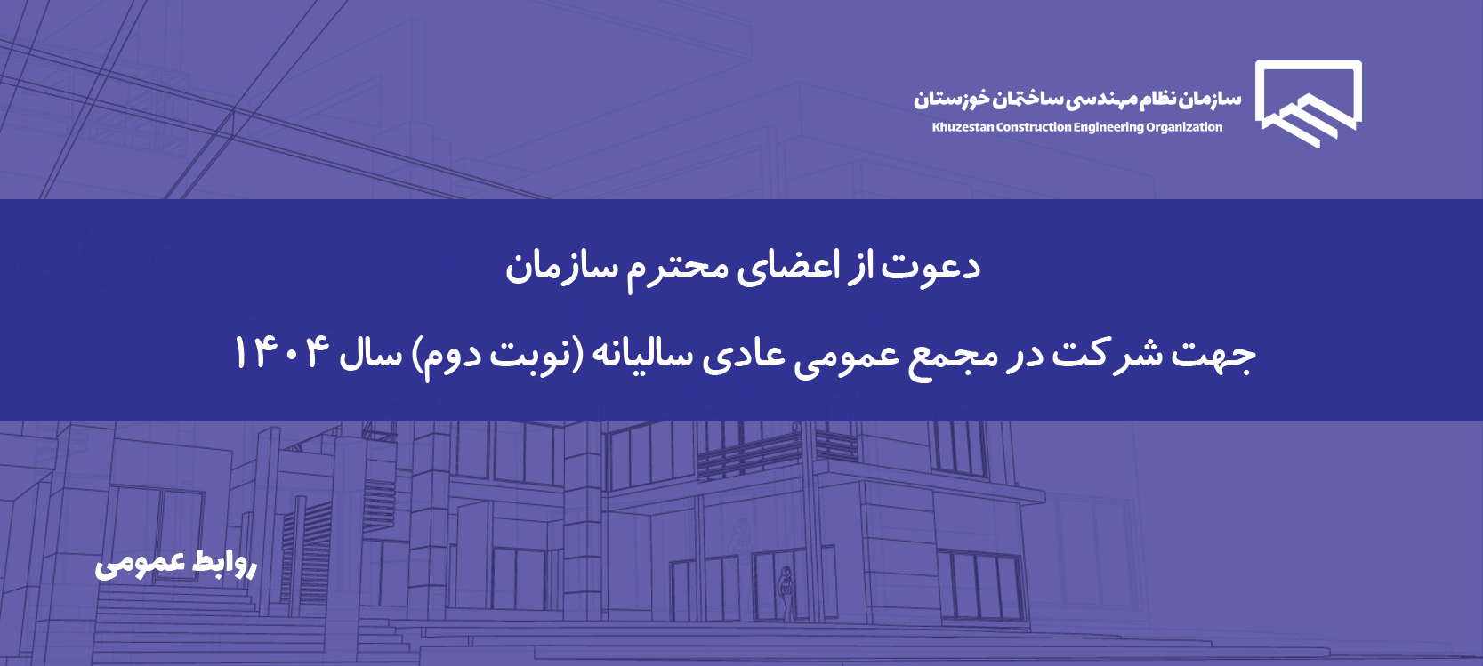 بدینوسیله از کلیه اعضای سازمان نظام مهندسی ساختمان استان خوزستان که دارای عضویت معتبر می باشند جهت شـرکت در جلسه مجمـع عمــومی عادی سالیانه (نوبت دوم) سال 1404 که در روز پنجشنبه مورخ 9 بهمن ماه 1404 رأس ساعت 9 صبح در محل تالار مهر واقع در اهواز – بلوار لشکر برگزار می گردد ، دعوت بعمل می آید.