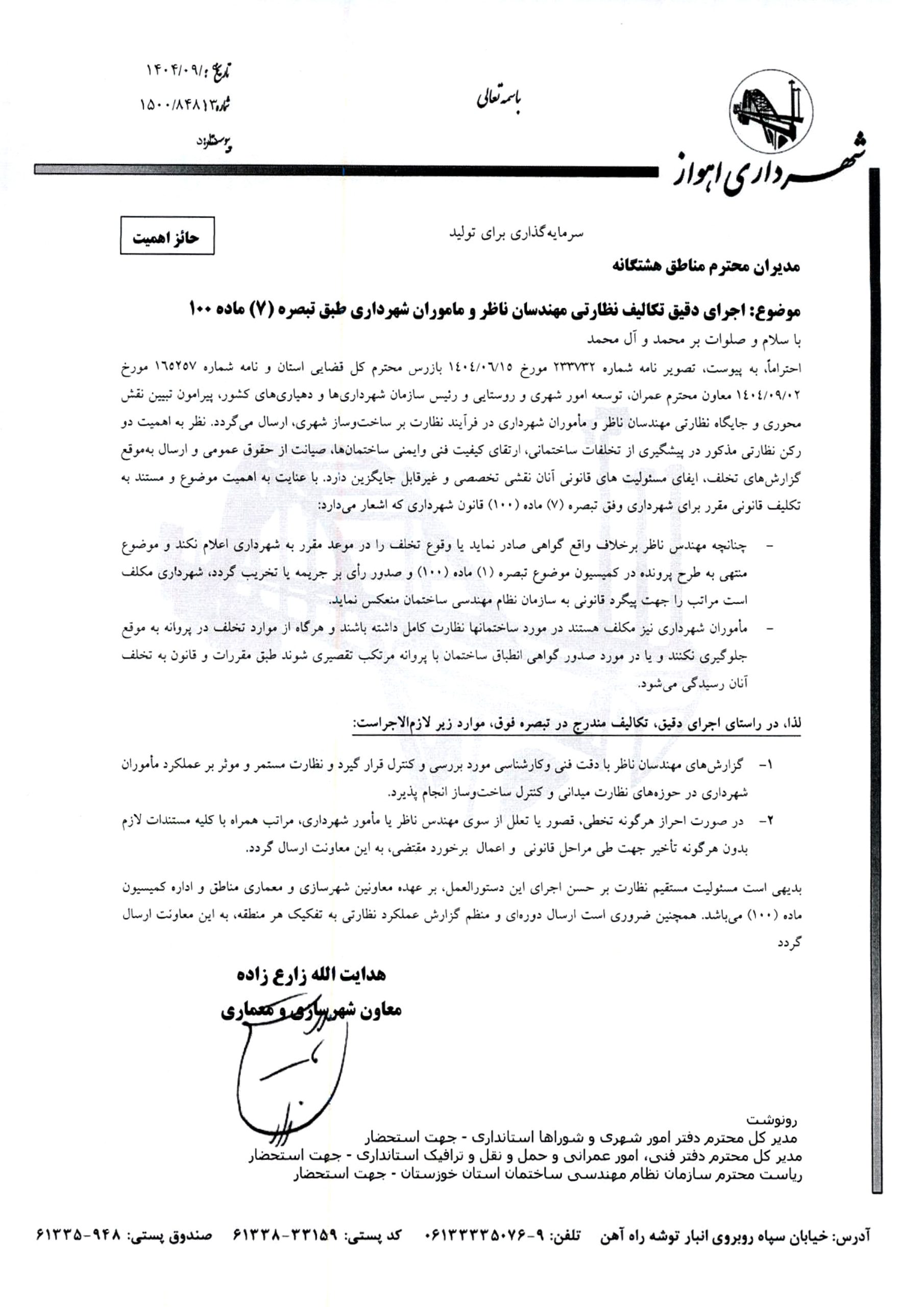 معاون شهرسازی و معماری شهرداری اهواز با صدور بخشنامهای خطاب به مدیران مناطق شهرداری، بر ضرورت اجرای کامل و بدون اغماض تکالیف قانونی مهندسان ناظر و مأموران شهرداری طبق تبصره ۷ ماده ۱۰۰ و جلوگیری از هرگونه تخلف ساختمانی تأکید کرد.