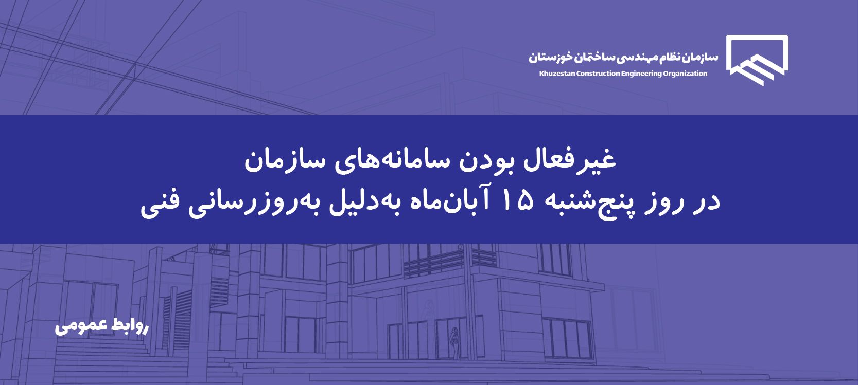 در پی اطلاعرسانی قبلی مبنی بر انجام عملیات بهروزرسانی و ارتقای زیرساختهای فنی و شبکهای سازمان نظام مهندسی ساختمان خوزستان، به اطلاع اعضای محترم و همکاران گرامی میرساند: