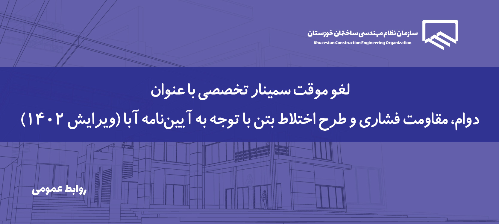 به اطلاع اعضای محترم سازمان نظام مهندسی ساختمان خوزستان میرساند، با توجه به درخواستهای مکرر اعضای گرامی، برنامهریزی لازم جهت برگزاری سمینار تخصصی با عنوان دوام، مقاومت فشاری و طرح اختلاط بتن با توجه به آییننامه آبا (ویرایش ۱۴۰۲) انجام و زمان برگزاری آن تعیین شده بود. با این حال، به دلیل عدم استقبال کافی از سوی اعضای محترم، برگزاری سمینار در موعد مقرر امکانپذیر نگردید و برگزاری آن تا اطلاع ثانوی به تعویق افتاده است.