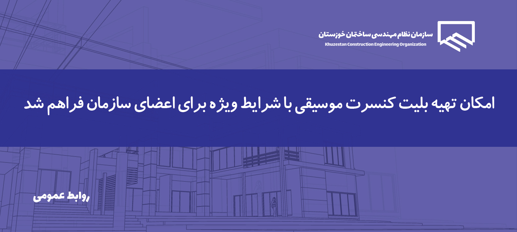 به گزارش روابط عمومی سازمان نظام مهندسی ساختمان استان خوزستان، این سازمان با پیگیریهای مستمر در حوزه خدمات رفاهی، بلیت کنسرت گرشا رضایی را که بطور معمول به قیمت یک میلیون تومان عرضه میشود، با نرخ ویژه ۳۰۰ هزار تومان برای اعضای محترم تهیه کرده است.