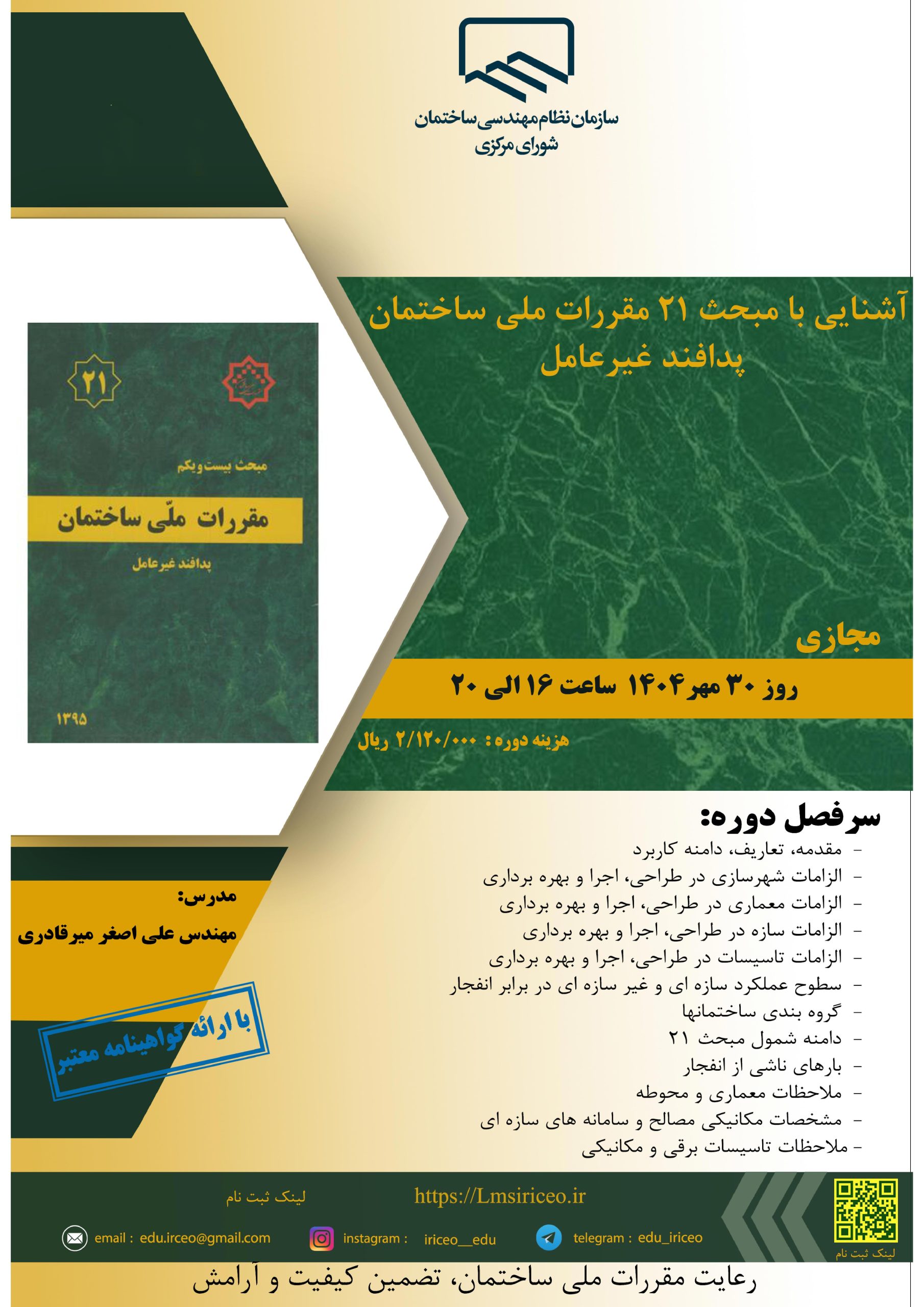 به منظور ارتقاء سطح دانش فنی و بروزرسانی اطلاعات حرفه‌ای مهندسان کشور، شورای مرکزی سازمان نظام مهندسی ساختمان اقدام به برگزاری مجموعه‌ای از دوره‌های آموزشی تخصصی و کاربردی در رشته‌های مختلف مهندسی ساختمان نموده است. این دوره‌ها با رویکرد آموزش‌های هدفمند، بر اساس نیازسنجی تخصصی و در هماهنگی با سیاست‌های وزارت راه و شهرسازی طراحی شده و در بستر آموزش مجازی برگزار خواهند شد.