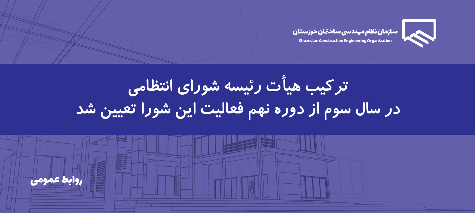 به گزارش روابط عمومی سازمان نظام مهندسی ساختمان خوزستان، در اجرای ضوابط و مقررات مربوط به ارکان سازمان، هیأت رئیسه شورای انتظامی در سال سوم از دوره نهم فعالیت این شورا تعیین شد.