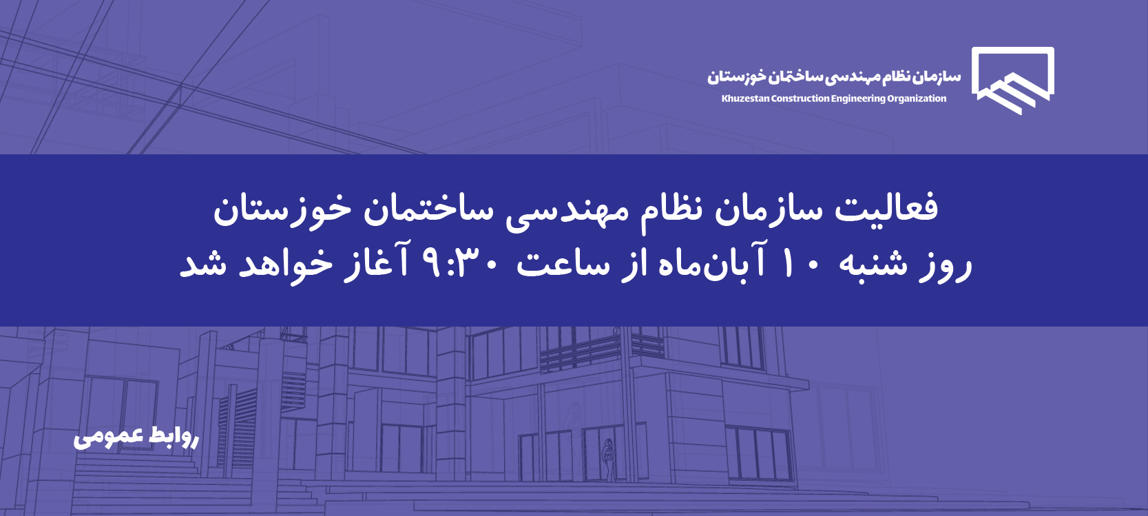 شایان ذکر است سازمان نظام مهندسی ساختمان خوزستان نیز در شهرستانهای یادشده در روز شنبه فعالیت خود را از ساعت ۹:۳۰ آغاز خواهد نمود.