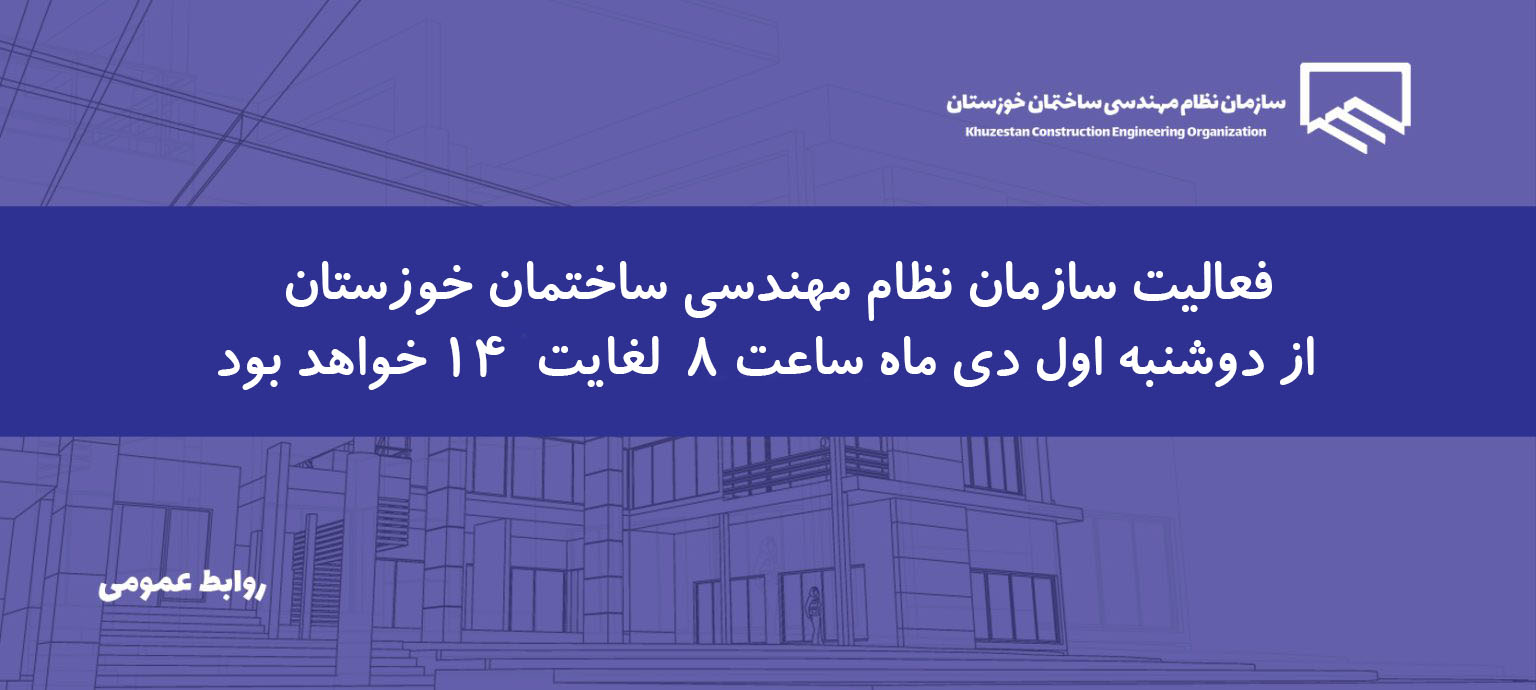 به گزارش روابطعمومی سازمان نظام مهندسی ساختمان استان خوزستان، پیرو بخشنامه ابلاغی معاونت توسعه مدیریت و منابع استانداری خوزستان، ساعت کاری ادارات از روز دوشنبه ۱ دیماه تا ۲۸ اسفندماه از ساعت ۸:۰۰ صبح لغایت ۱۴:۰۰ تعیین و لازمالاجرا اعلام شده است.