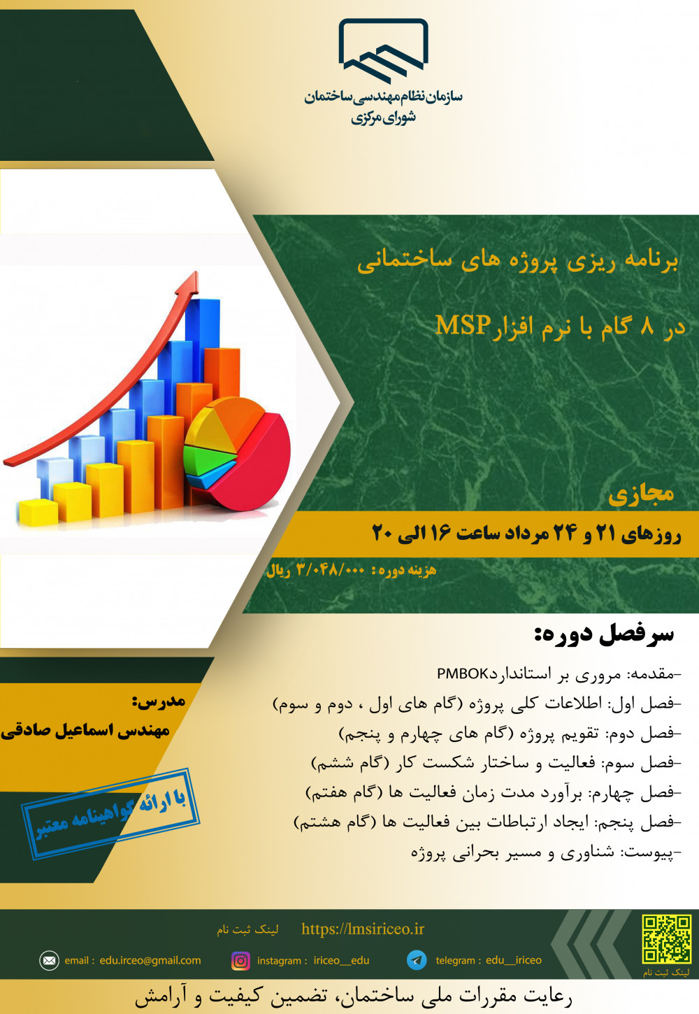 به گزارش روابط عمومی نظام مهندسی خوزستان به نقل از مدیریت آموزش نظام مهندسی کشور دوره آموزشی با عنوان“ برنامه ریزی پروژه های ساختمانی در ۸ گام (با نرم افزارMSP) “ در روز روزهای یکشنبه و چهارشنبه 21 و 24 مرداد ماه 1403 از ساعت 16 الی 20 برگزار می نماید.