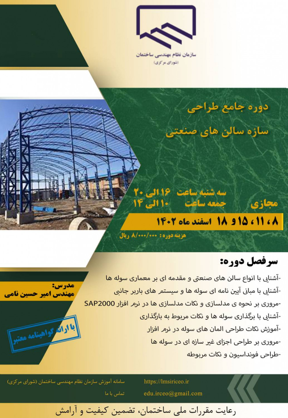 به گزارش روابط عمومی سازمان نظام مهندسی به نقل از مدیریت آموزش نظام مهندسی کشور دوره آموزشی با عنوان” دوره جامع طراحی سازه سالن های صنعتی مورخ 8-11-15 و 18 اسفندماه برگزار میشود، شایان ذکر است این دوره سه شنبه ها ساعت 16 الی 20 و جمعه ها ساعت 10 الی 14 به صورت مجازی برگزار میگردد.