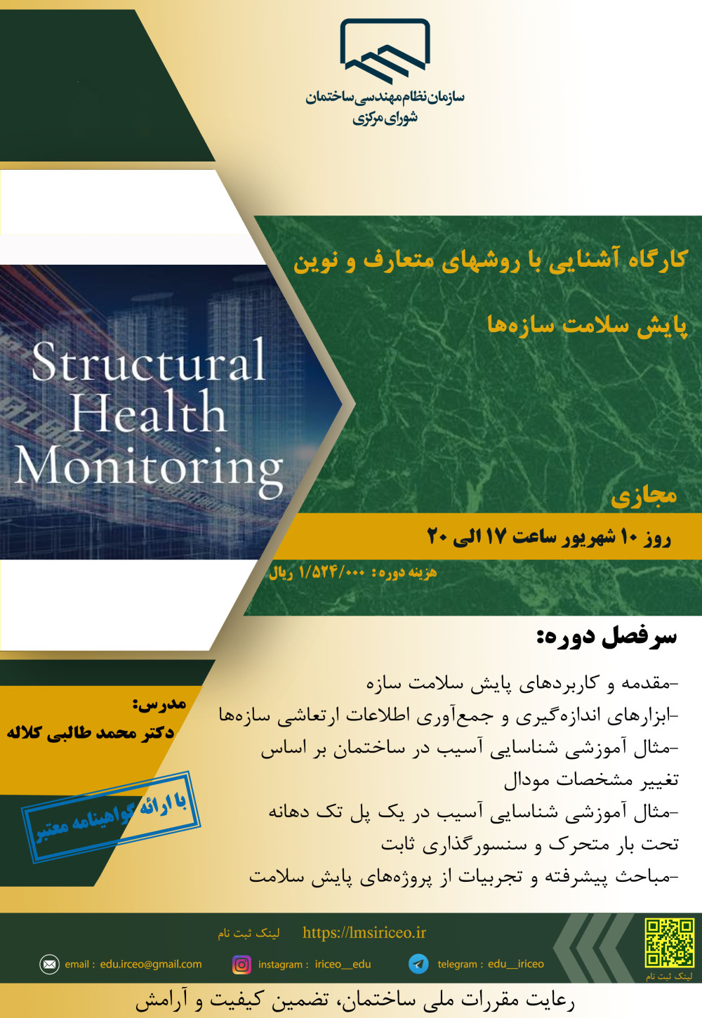 به گزارش روابط عمومی نظام مهندسی خوزستان به نقل از مدیریت آموزش نظام مهندسی کشور دوره آموزشی با عنوان“ روشهای متعارف و نوین پایش سلامت سازهها“ در روز شنبه 10 شهریور 1403 از ساعت 17 الی 20 برگزار می نماید.