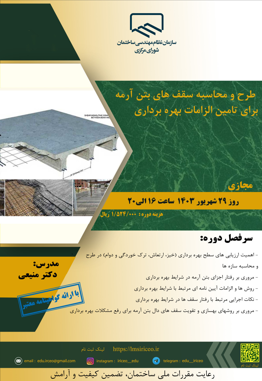 به گزارش روابط عمومی نظام مهندسی خوزستان به نقل از مدیریت آموزش نظام مهندسی کشور دوره آموزشی با عنوان“ محاسبه سقف های بتن آرمه برای تامین الزامات بهره برداری “ در روز پنج شنبه 29 شهریور 1403 از ساعت 16 الی 20 برگزار می نماید.