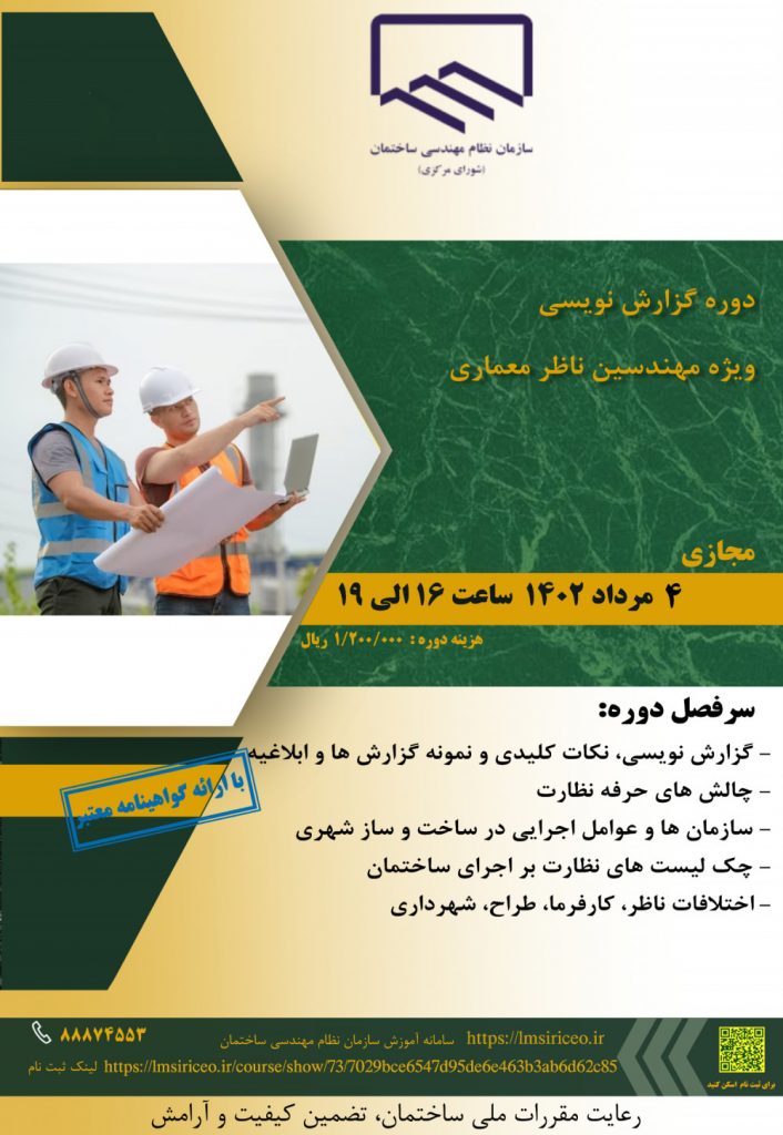احتراماً به اطلاع می رساند مدیریت آموزش سازمان نظام مهندسی ساختمان کشور دوره آموزشی با عنوان”گزارش نویسی ویژه مهندسین ناظر معماری” را ساعت 16 الی ۱9 روز چهارشنبه مورخ 4 مرداد ماه 1402 برگزار نماید.