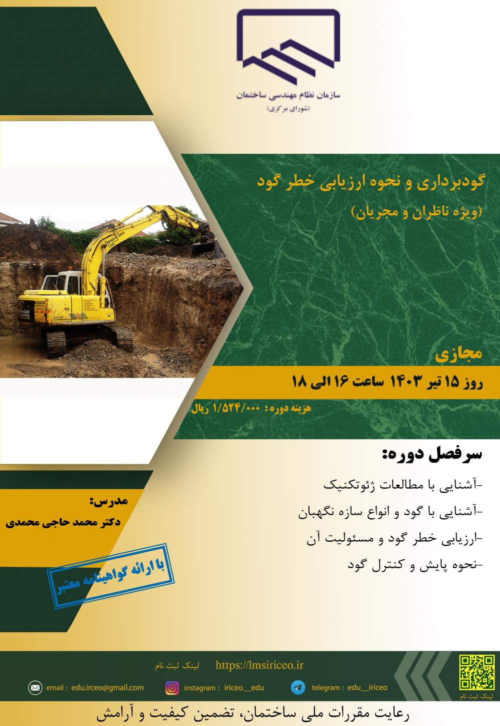 به گزارش روابط عمومی نظام مهندسی خوزستان به نقل از مدیریت آموزش نظام مهندسی کشور دوره آموزشی با عنوان” گودبرداری و نحوه ارزیابی خطر گود (ویژه ناظران و مجریان) ” مورخ جمعه 15 تیرماه 1403 از ساعت 16 الی 18 برگزار می نماید.