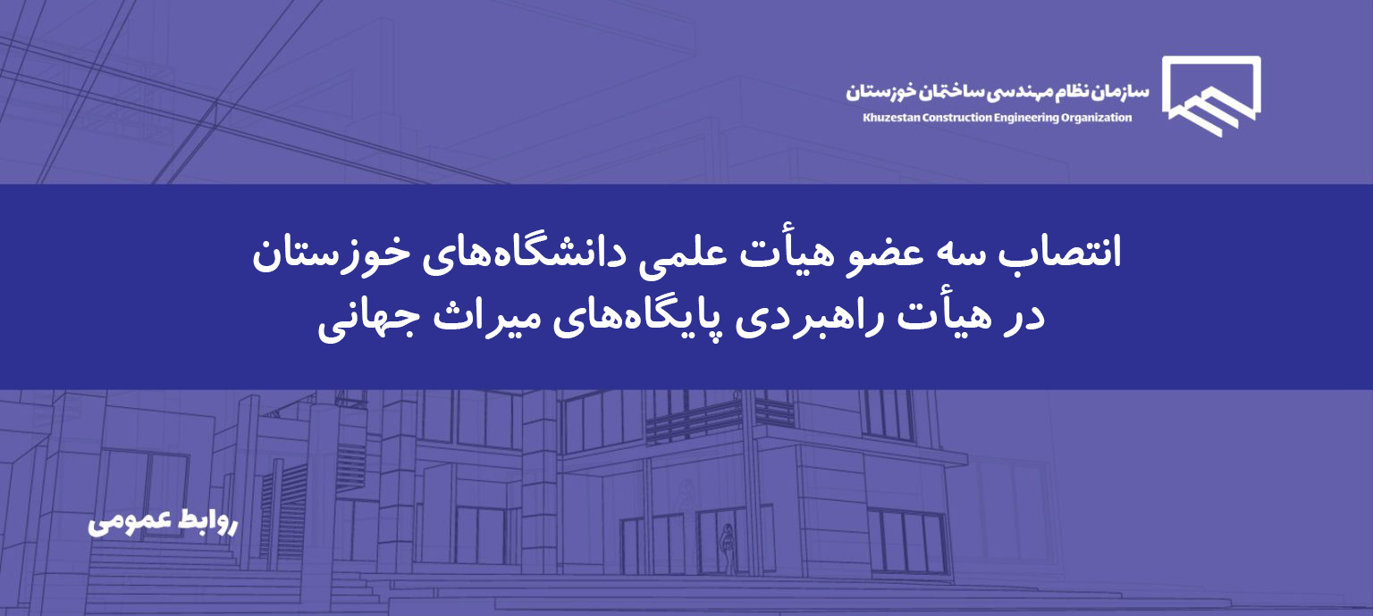سه عضو هیات علمی دانشگاه های صنعتی جندیشاپور دزفول و شهید چمران اهواز با صدور احکامی از سوی قائممقام وزیر میراث فرهنگی، گردشگری و صنایع دستی به عنوان اعضای ثابت هیات راهبردی پایگاههای جهانی شوش، چغازنبیل و هفتتپه منصوب شدند.