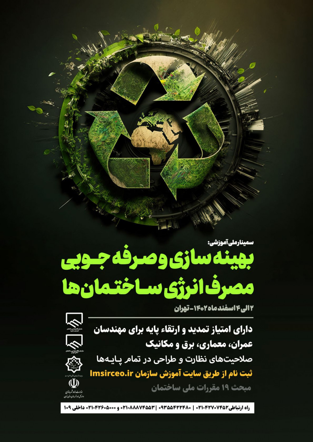 اعضای محترم سازمان جهت ثبت نام در سمینار آموزشی بهینه سازی و صرفه جویی مصرف انرژی ساختمان که مورخ 2 الی 4 اسفندماه 1402 در تهران برگزار میگردد از طریق سایت آموزش سازمان اقدام نمائید.