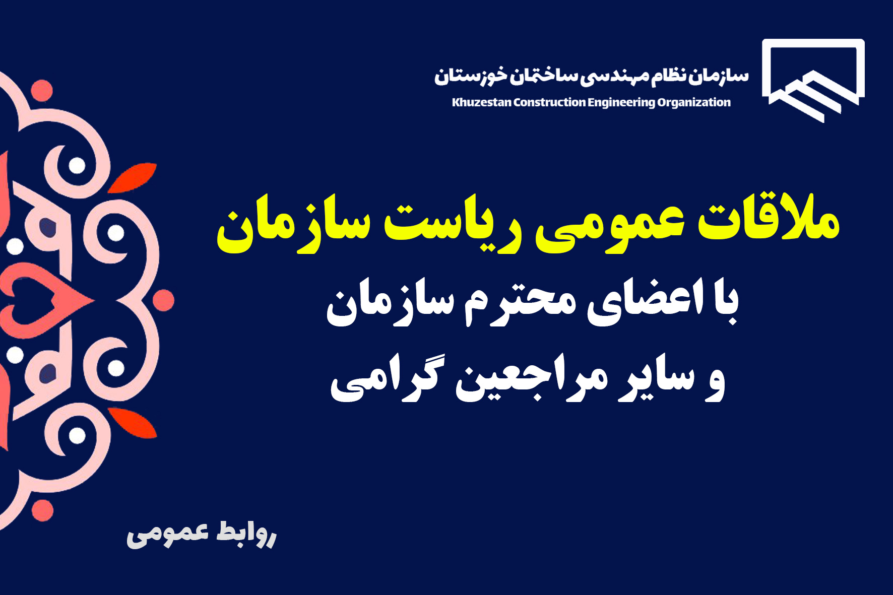 به اطلاع اعضای محترم سازمان و همچنین سایر مراجعین گرانقدر میرساند که جلسه ملاقات عمومی با رئیس سازمان در روزهای دوشنبه هر هفته برگزار خواهد شد.