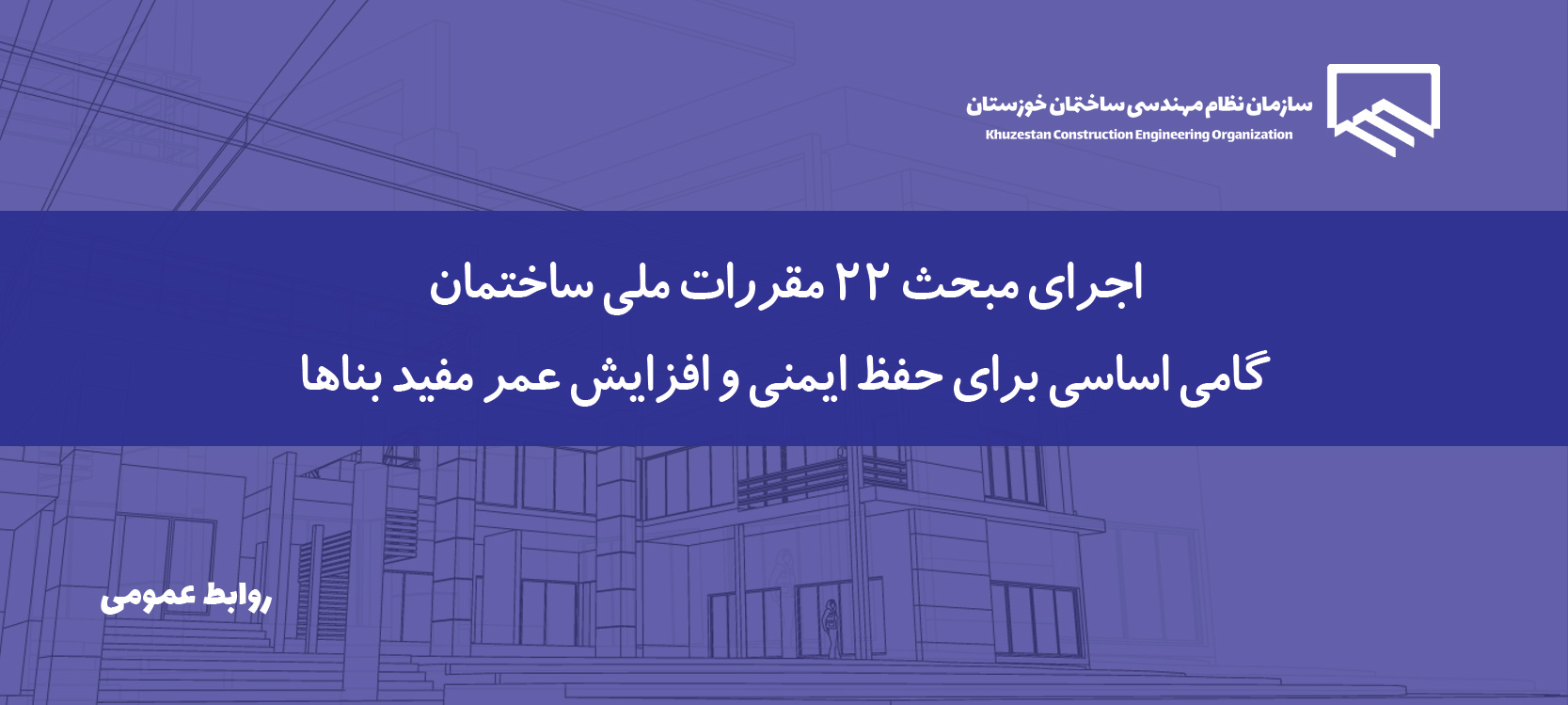 به گزارش روابط عمومی سازمان نظام مهندسی ساختمان استان خوزستان، مهندس مهدی قنواتی، عضو هیأت مدیره سازمان، در توضیح ضرورت اجرای مبحث ۲۲ مقررات ملی ساختمان اظهار داشت: با توجه به نقش حیاتی ساختمانها در تأمین ایمنی و رفاه جامعه، رعایت الزامات مبحث ۲۲ در تمامی مراحل طراحی، اجرا و بهرهبرداری ضروری است. این مبحث ناظر بر نحوه نگهداری، تعمیر و بهرهبرداری ایمن از ساختمانهاست و بیتوجهی به آن میتواند خسارات جبرانناپذیری در پی داشته باشد.