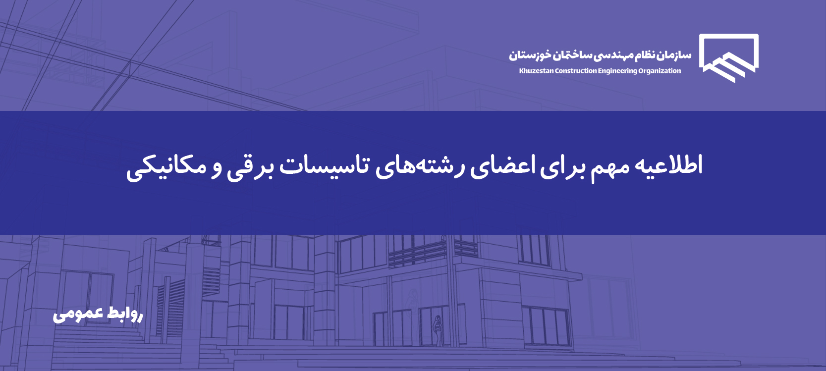 واحد روابط عمومی سازمان نظام مهندسی ساختمان خوزستان از اعضای محترم رشتههای تاسیسات برقی و مکانیکی درخواست کرد نسبت به مفاد نامه ابلاغی از سوی سازمان نظام مهندسی ساختمان کشور دقت لازم را داشته و بهرهبرداری مقتضی را از آن به عمل آورند.