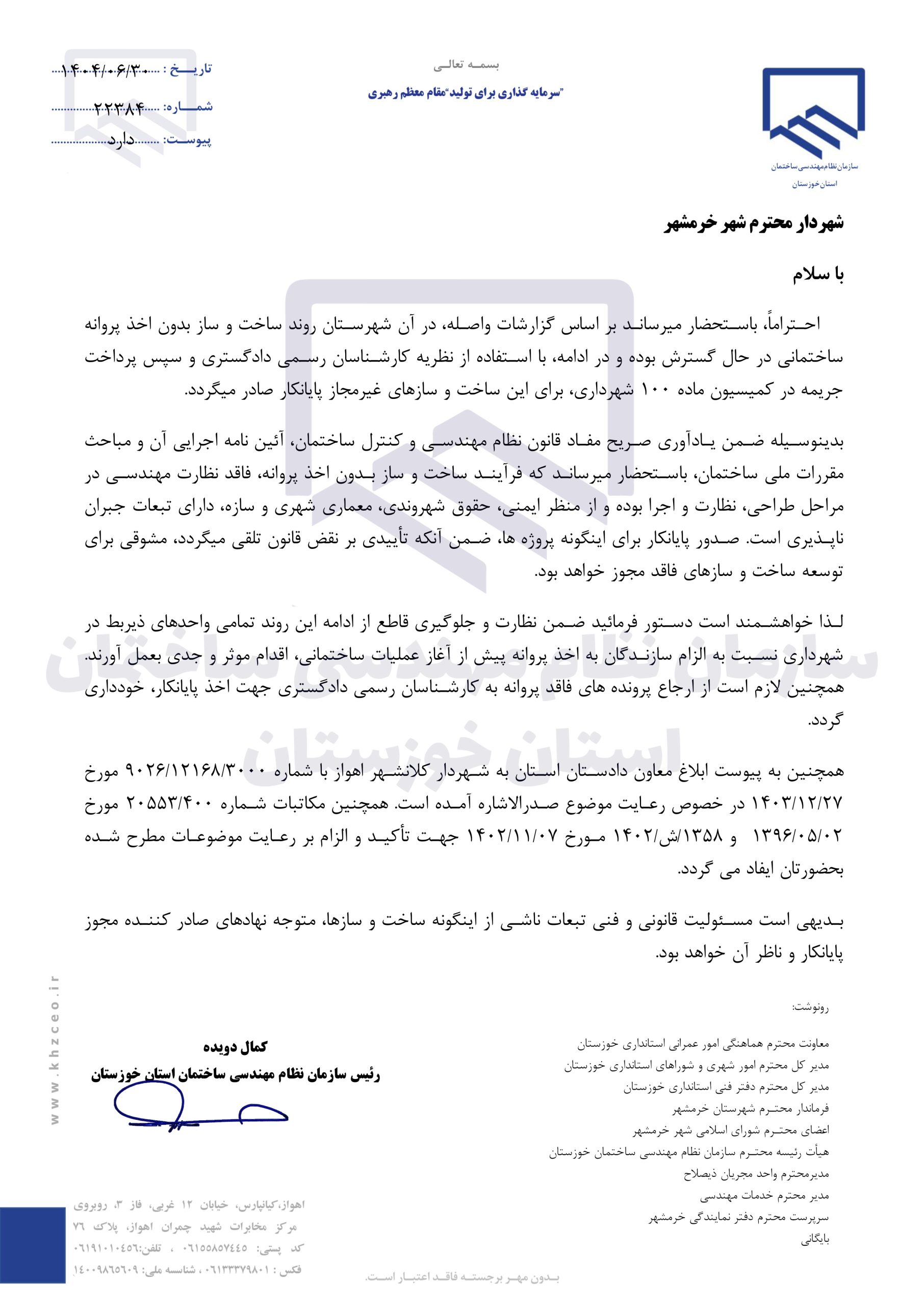 به گزارش روابط عمومی سازمان نظام مهندسی ساختمان خوزستان، مهندس کمال دویده، رییس سازمان، طی مکاتبه‌ای رسمی با شهرداران همه شهرستان‌های استان، نسبت به روند ساخت‌وسازهای بدون اخذ پروانه و خارج از چارچوب مقررات ملی ساختمان هشدار داد و خواستار اقدام فوری شهرداری‌ها در جلوگیری از ادامه این روند شد.