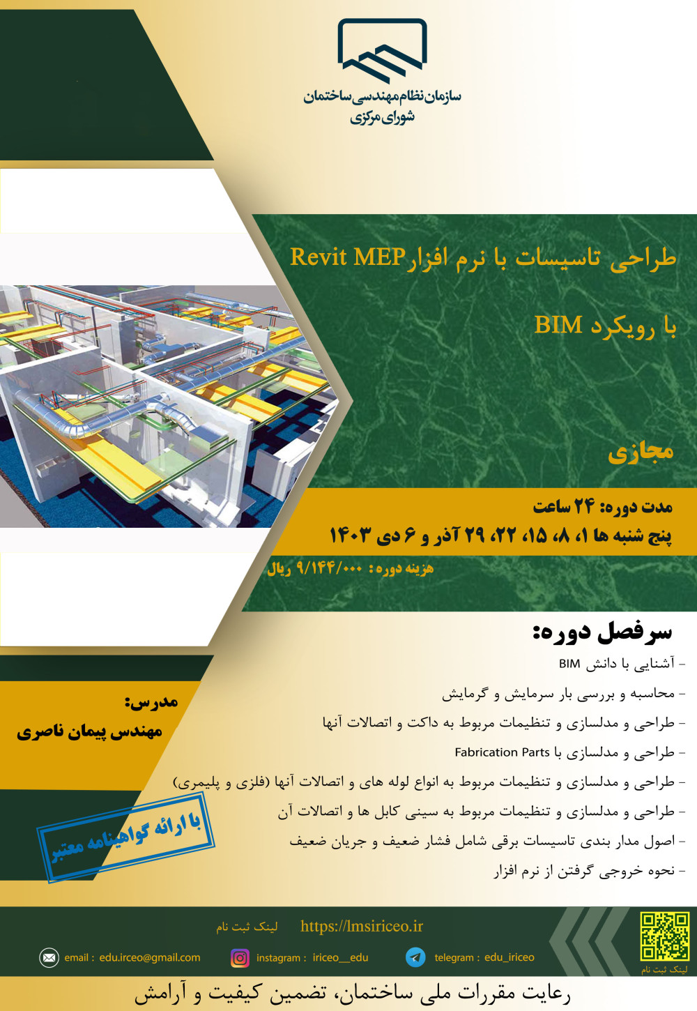 به گزارش روابط عمومی نظام مهندسی خوزستان به نقل از مدیریت آموزش نظام مهندسی کشور دوره آموزشی با عنوان“ طراحی تاسیسات با نرم افزار Revit MEP با رویکرد BIM“ در روزهای پنجشنبه به مدت 6 هفته، 1، 8، 15، 22، 29 آذر و 6 دی ماه 1403 از ساعت 16 الی 20 برگزار می نماید.