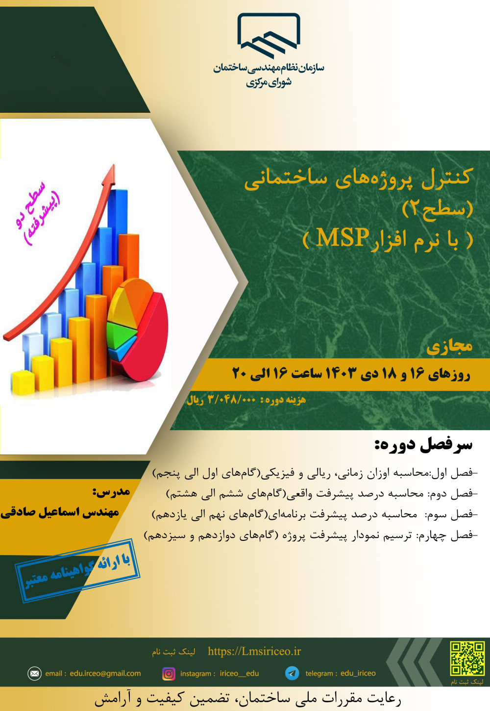 به گزارش روابط عمومی سازمان نظام مهندسی ساختمان خوزستان به نقل از مدیریت آموزش نظام مهندسی کشور دوره آموزشی با عنوان” کنترل پروژههای ساختمانی (سطح۲)(با نرم افزارMSP) ” در روزهای یکشنبه و سه شنبه 16 و 18 دی ماه 1403 از ساعت 16 الی 20 برگزار می نماید.