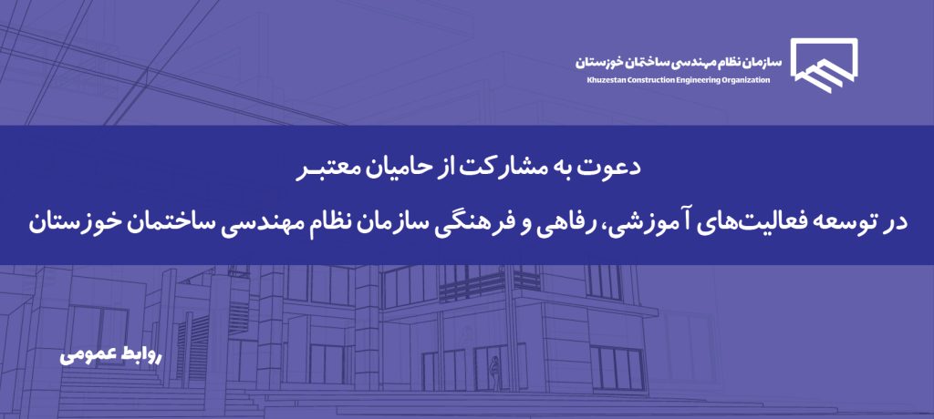 13 آبان فراخوان جذب حامیان معتبر جهت توسعه خدمات رفاهی، فرهنگی و آموزشی بدینـوسیله به اطلاع کلیه اعضا و علاقهمندان محترم میرساند، سازمان نظام مهندسی ساختمان خوزستان با هدف تقویت و توسعه خدما... ادامه مطلب
